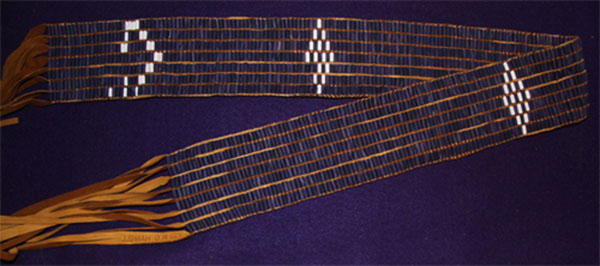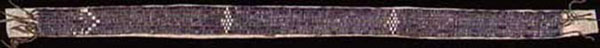 dark purple belt woven on buckskin thongs. It bears the designs of two